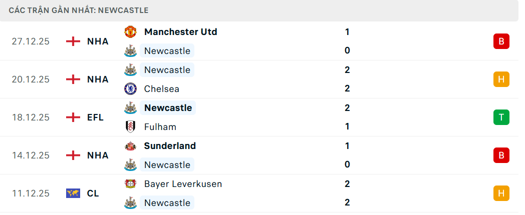 Phong độ đội Newcastle (5 trận gần nhất)