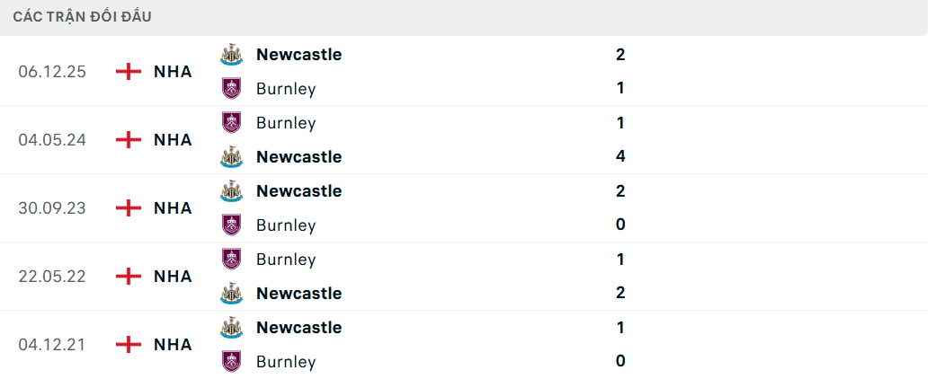 Lịch sử đối đầu (Head to Head) Burnley vs Newcastle